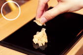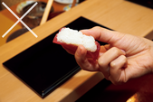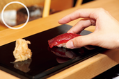 当店のお寿司は、シェフがお出しする前に醤油を塗ってありますので、再度塗る必要はありません。ただし、醤油が足りない場合は、生姜の甘酢漬けをブラシのように使ってください。お寿司を醤油に浸すと、崩れやすくなります。